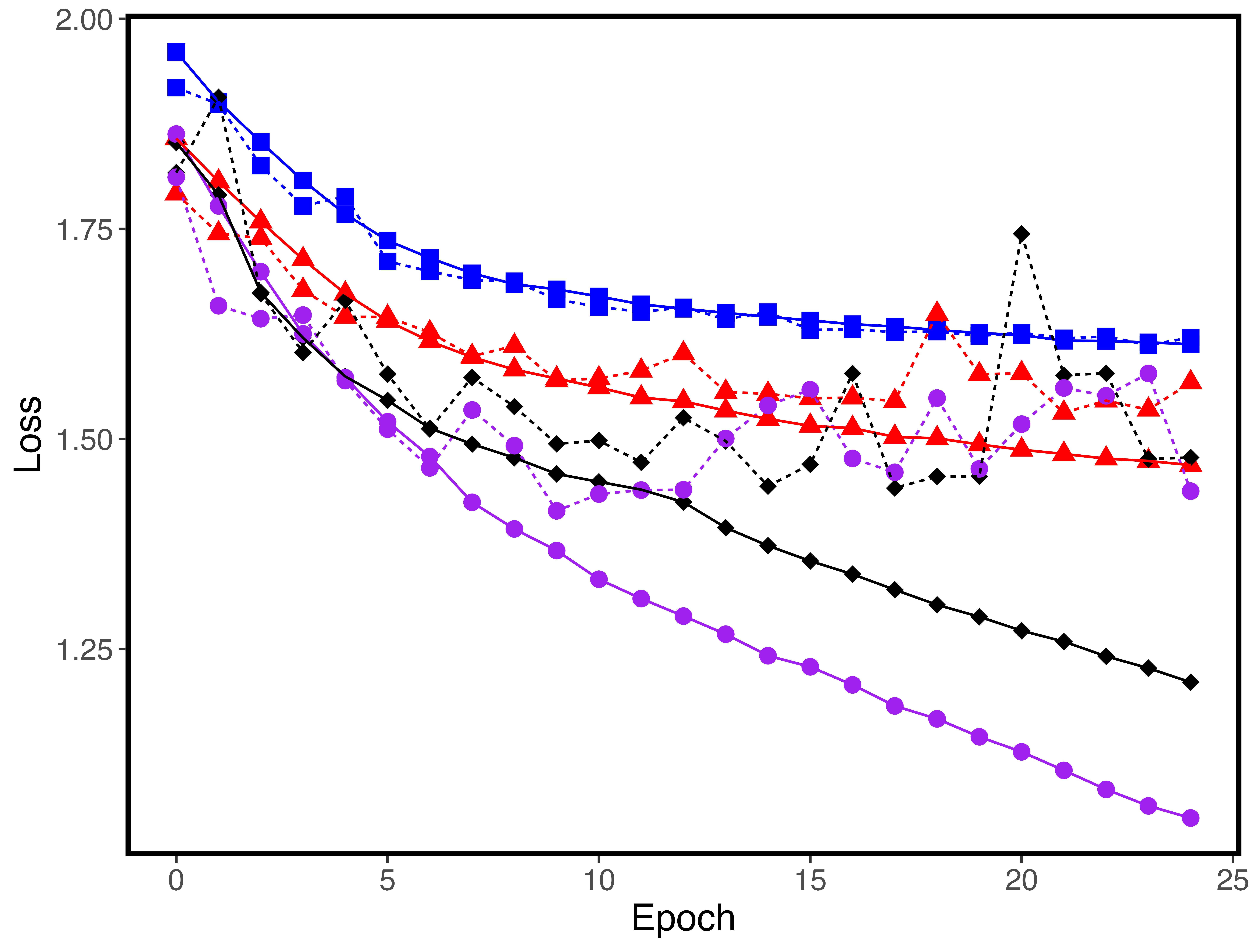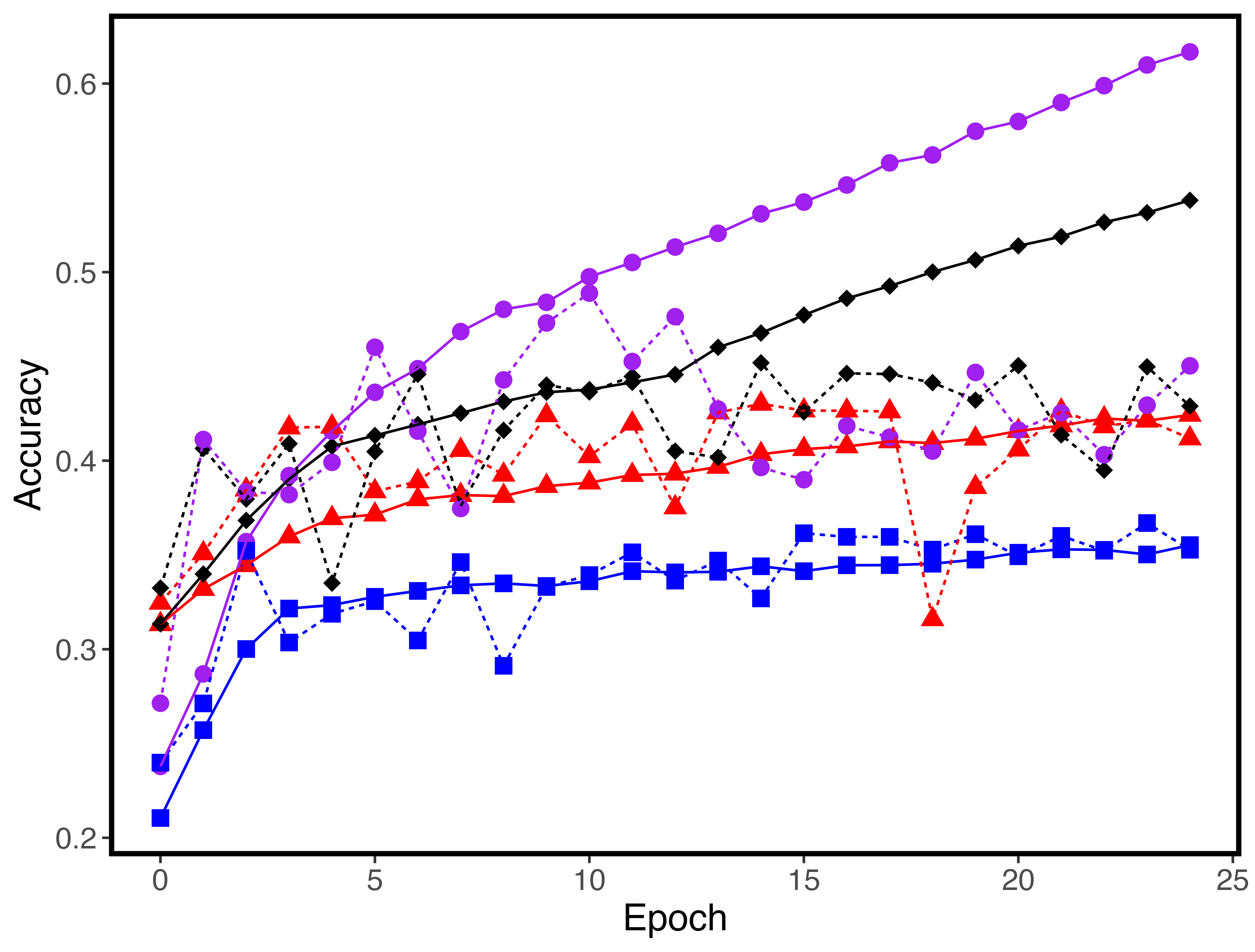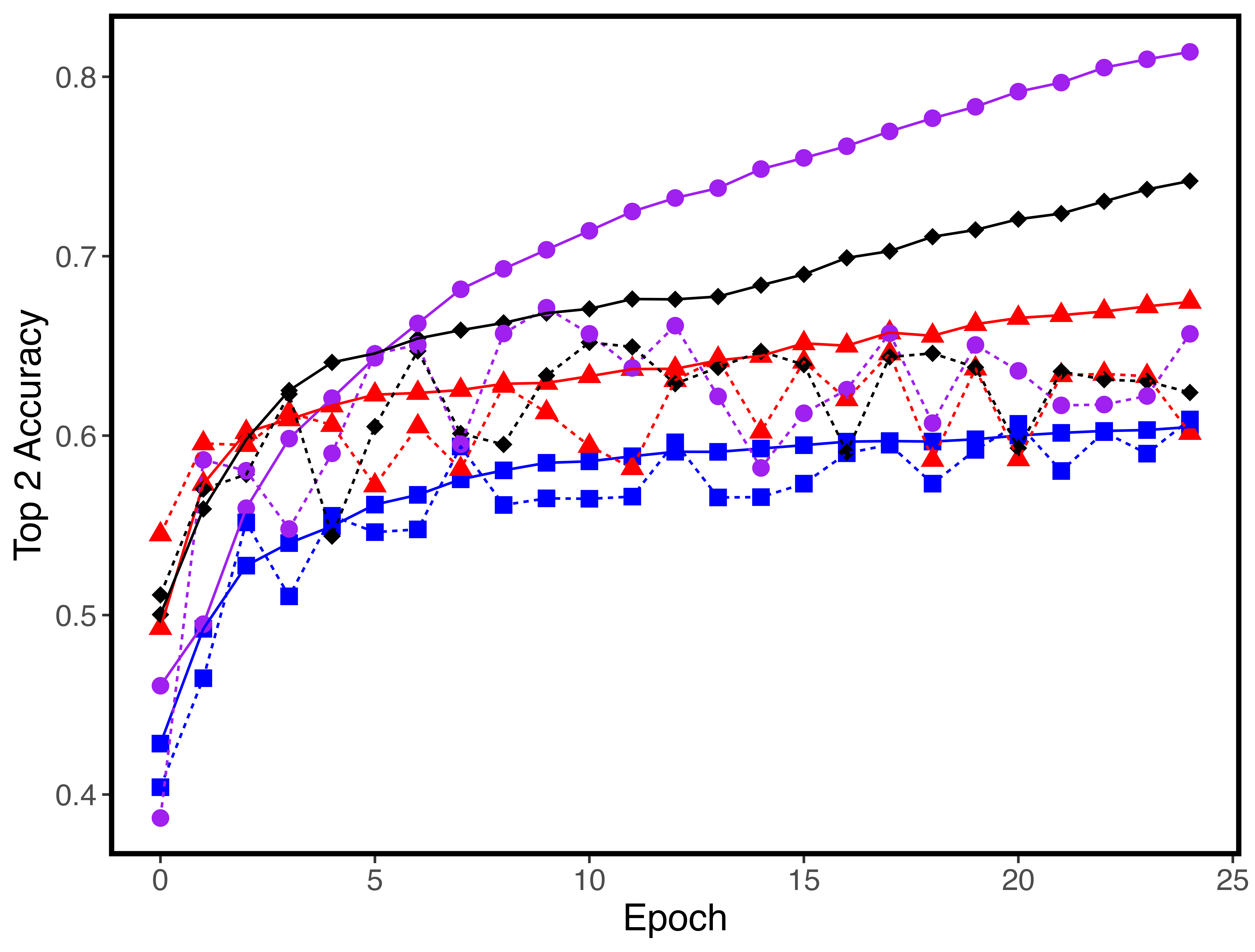 As a baseline, the convolution-free neural network performs considerably worse than the rest of the models. However, it interestingly does not overfit as the rest of the models do, as shown by the non-divergence of the training and validation curves for loss, accuracy, and top-two accuracy. The lack of flexibility of just one dense layer seems to prevent the model from capturing the complexities of image data, limiting both the predictive capabilities of the model and the extent to which it can overfit to the data. This confirms the basic intuition that convolutions are a valuable tool for the task of image classification.