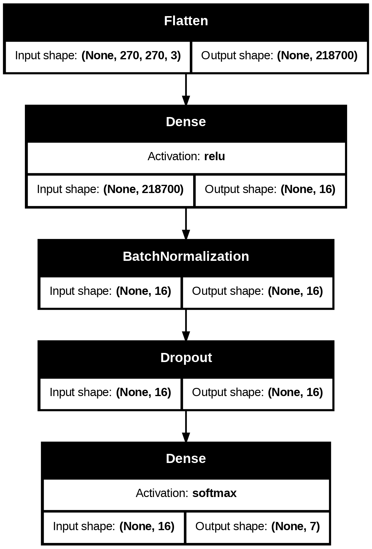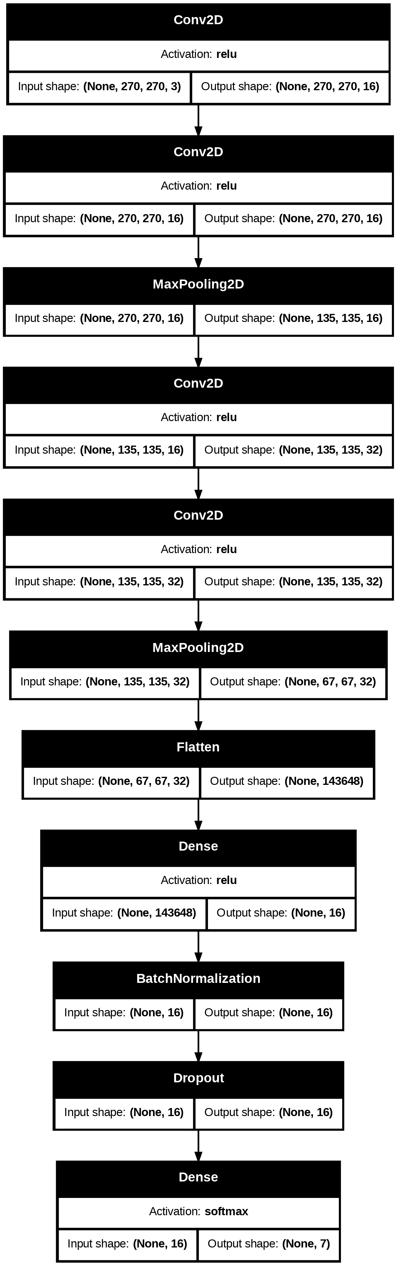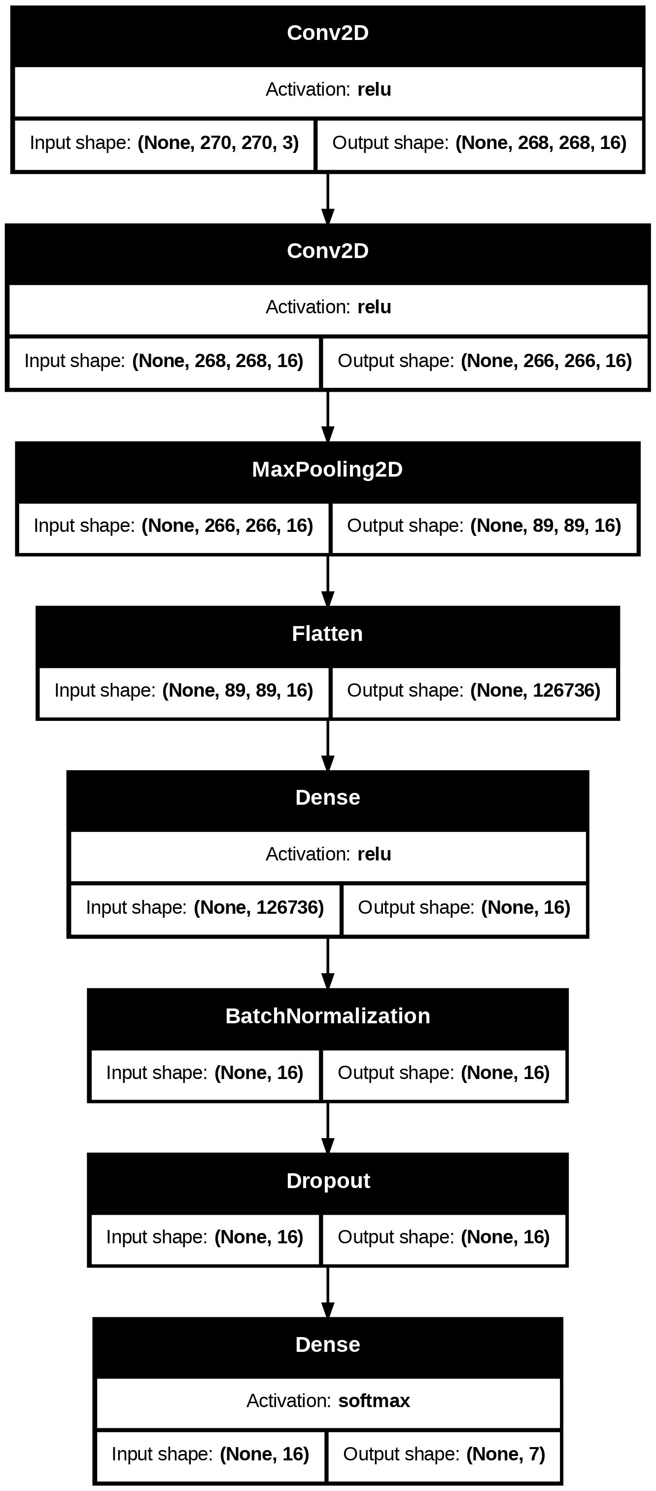 To establish a baseline, first a single dense layer is fit, not leveraging any of the typical tools used in image analysis with neural networks. Next, a simple convolutional network is fit, employing two convolutional layers fed into max pooling layer, ultimately ending with a dense layer taking the pooling layer as input and outputting to the seven node output layer. With these baselines established, tools from the famous neural network architectures VGG-16