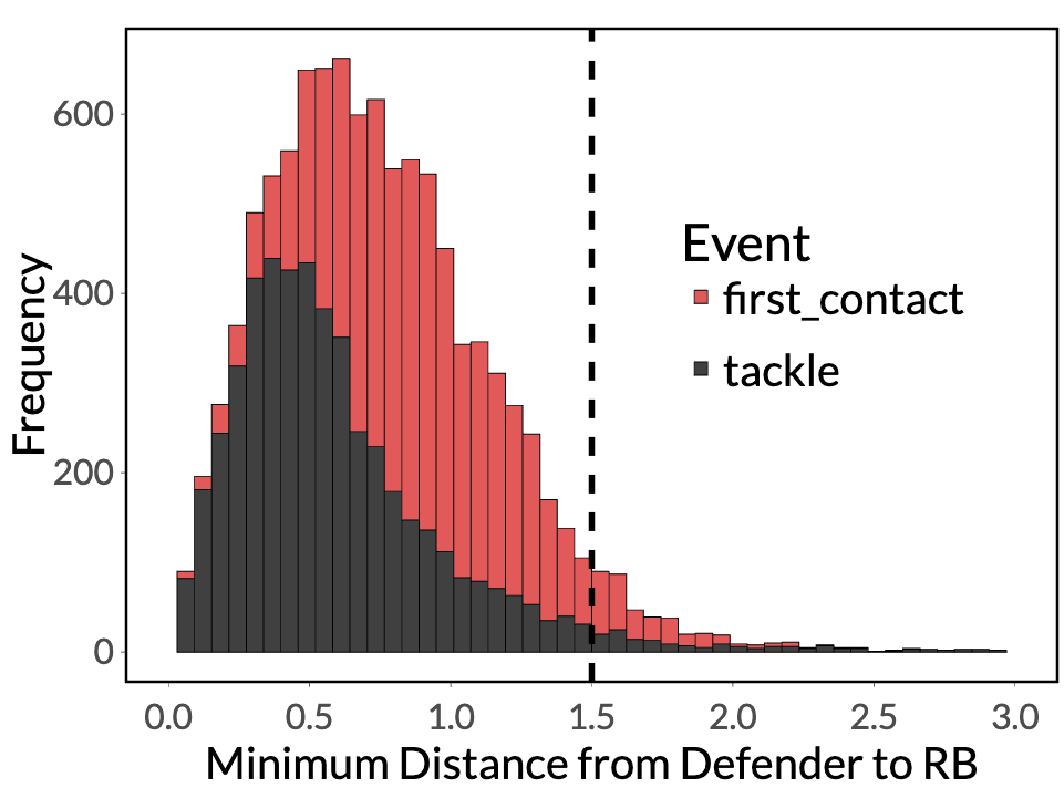 In the momentum-based fractional tackles project from CMU, they consider a defender to have a “contact opportunity” if they are within 1.5 yards of the RB. To choose this number, they examined the distribution of distance from the RB to the nearest defender for the frames with first contact or tackle events. Below is that same plot for the plays and frames that I examined (they used a slightly different subset). The 1.5 yard criteria looks like a perfectly reasonably cutoff for our purposes as well (see below).