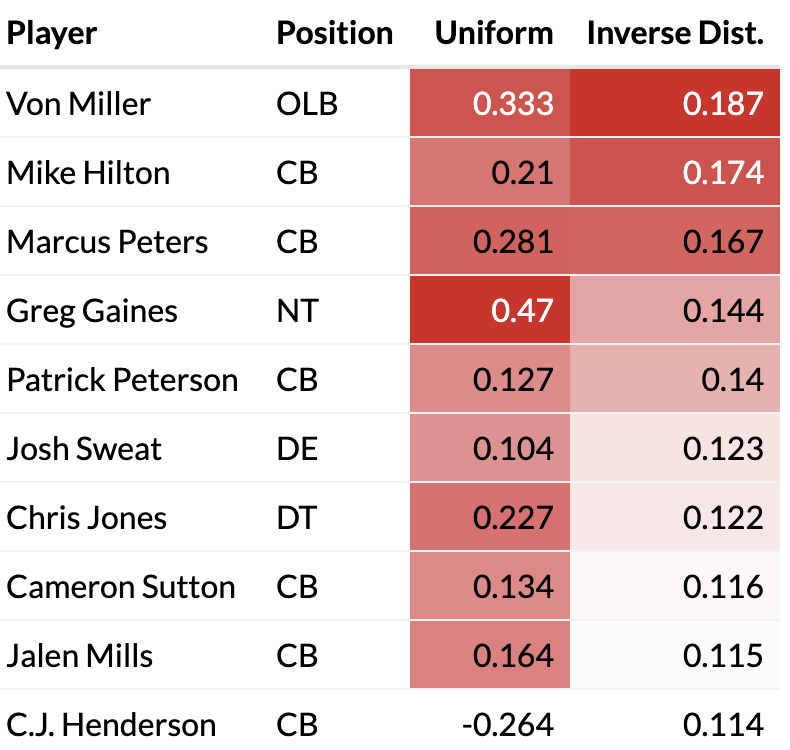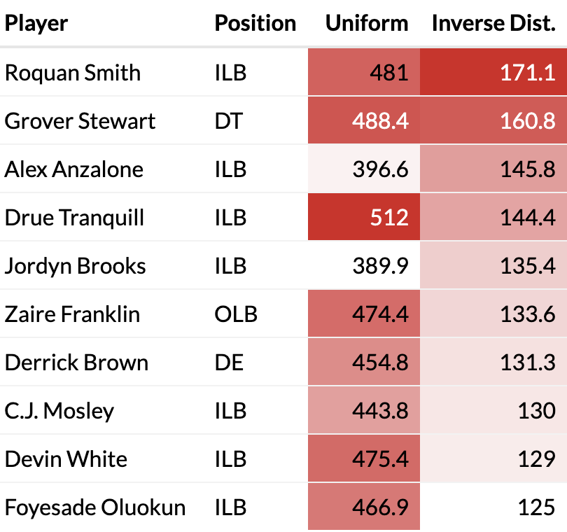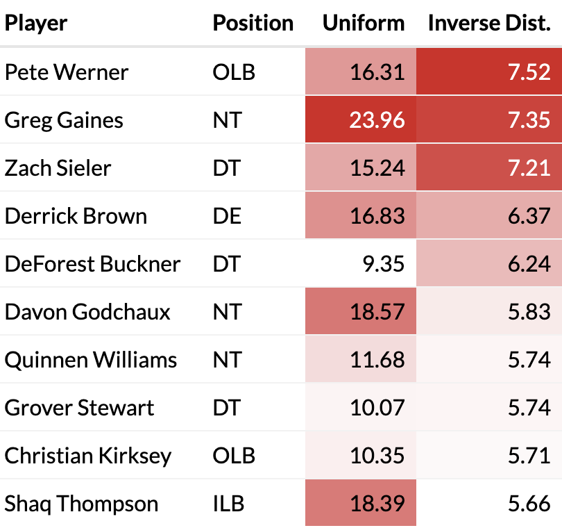 The players that accumulate the greatest totals in yards/points saved are the players that are involved with stopping the run most consistently. Namely, the front seven. The players that save the most yards are the linebackers, who are put into higher-leverage yardage saving opportunities than defensive linemen tend to be. Additionally, the defensive line is primarily responsible to stopping plays like quarterback sneaks and goalline rushes, which gives them high-leverage points saving opportunities. Looking at the top per-opportunity performers, we see mostly cornerbacks, who don’t get tasked with stopping the run as often, but when they have to it is to stop home run plays than a player in the front seven might face. Jonathan Taylor’s run above is one such example.