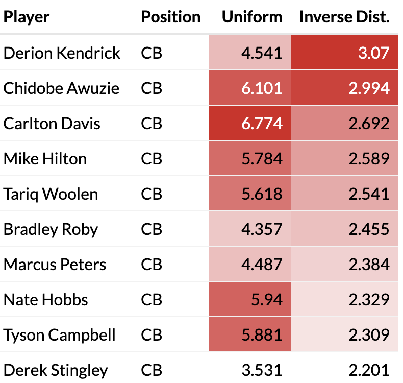 This sort of credits players without worrying about what has happened earlier on the play. We just look at the differences between frames, so a player breaking free is not continuously penalized. This could be interpreted as good or bad. I don’t consider more long range impact where an RB may change direction in anticipation of a defender a few yards down field.